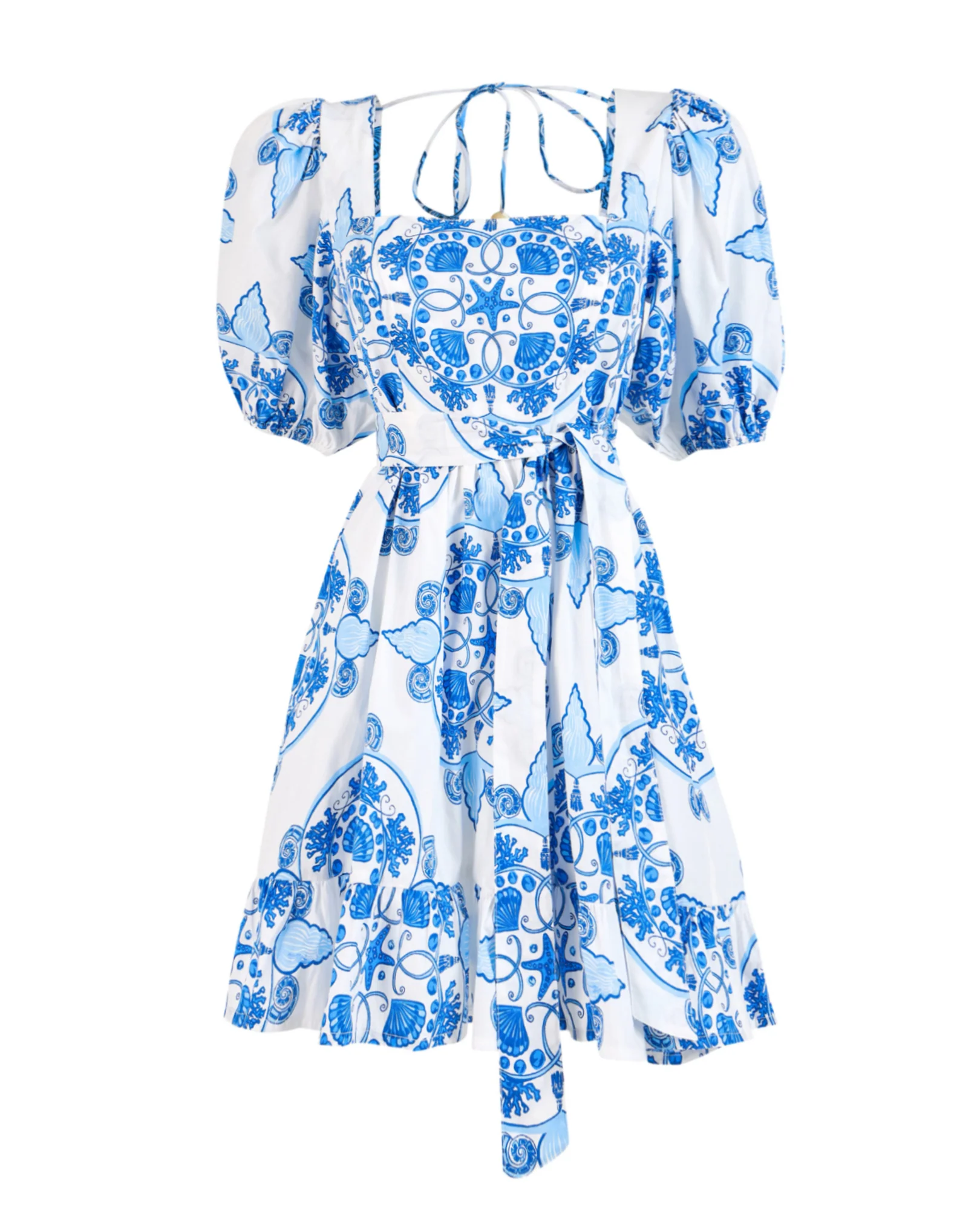 Elevate your summer style with the Kiera mini. This essential piece features a square neckline, puff sleeves, fitted waist, and A-line silhouette, ensuring a flattering fit. The delightful surprise of a deep cut-out in the back, complemented by a charming tie detail, adds an extra layer of sophistication to this must-have garment. Kiera is crafted from breathable premium Cotton Poplin. Journey back in time with our âNautilusâ print design, echoing the exquisite 19th century shell drawings of renowned French naturalist Jean Charles Chenu.