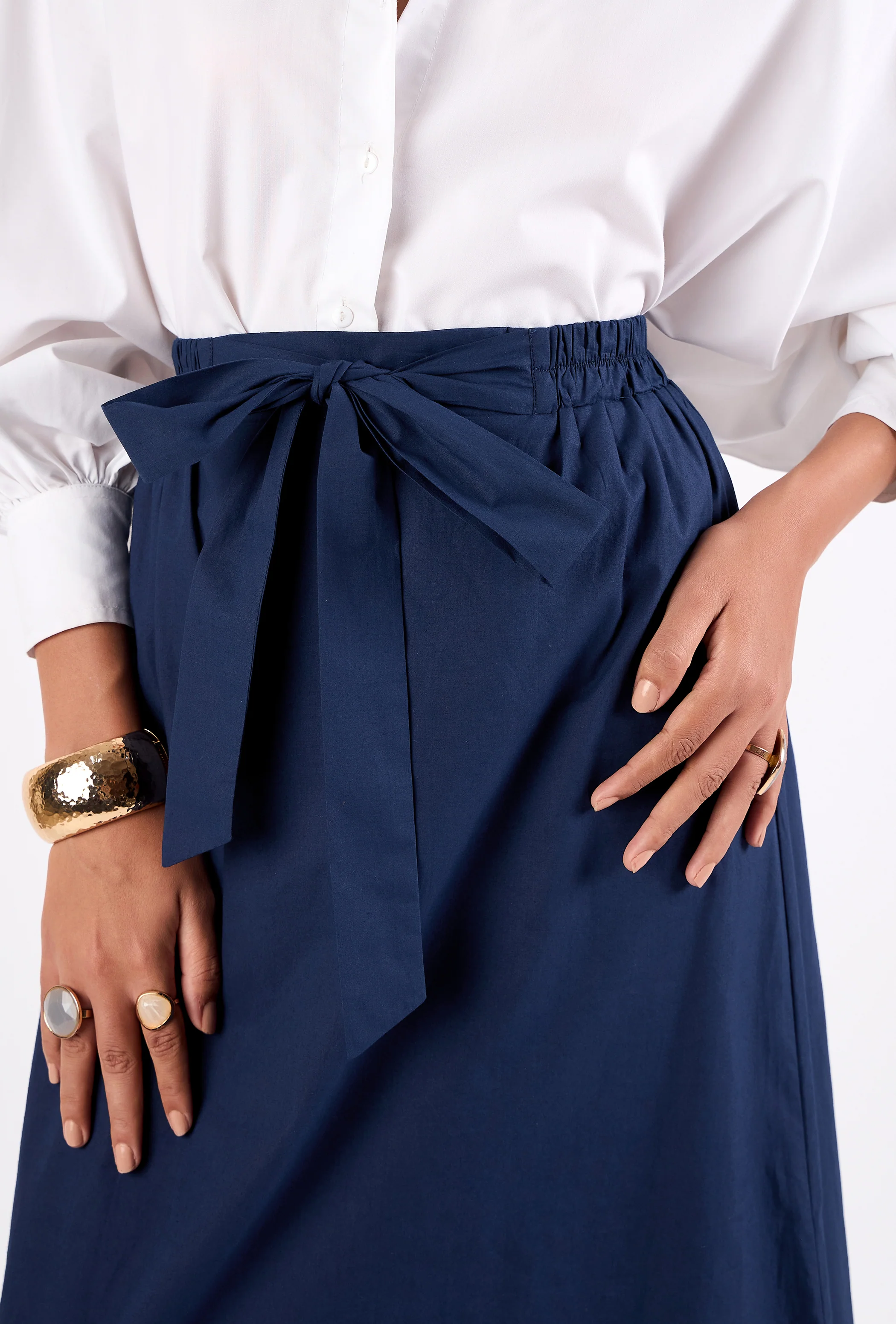 With its straight shape, hidden pockets and banded waist featuring back elastic, the Tyler skirt exudes understated sophistication. Complete with a removable tie sash, subtle side slits, and a fully lined construction, it's a versatile must-have for any wardrobe. Tyler is crafted from breathable premium Cotton Poplin.