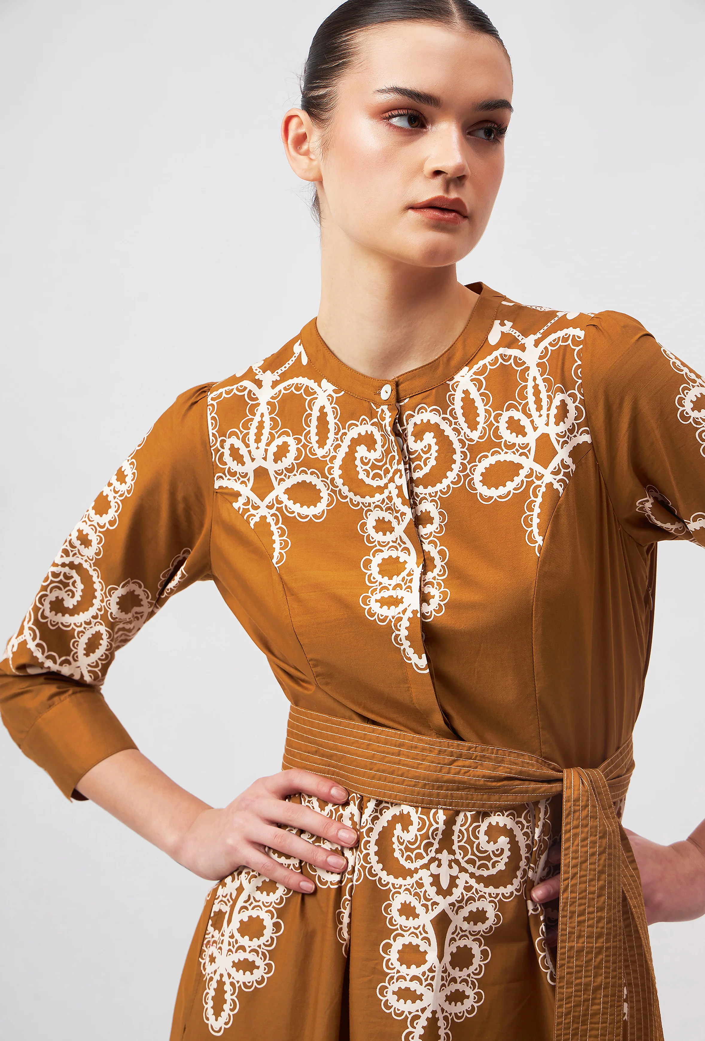 The Harper is the epitome of modern classic style. The short midi shirt dress with concealed buttons, a round neckline, full sleeves, and a fitted bodice and waist exudes understated luxury. The included belt ensures an even more defined waist. “Medina” channels the elegance and craftsmanship of a Moroccan vintage bridal gown. The artwork pays homage to the intricate lacework and delicate embroidery traditionally hand-sewn onto heavy silks and brocade.