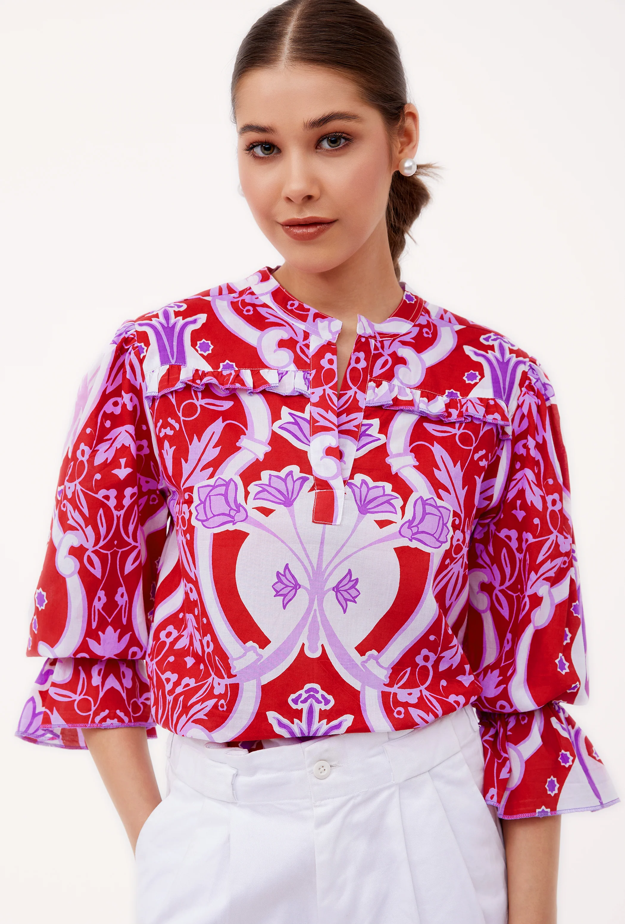 With its slightly puffed 3/4 sleeves, relaxed cut and delicate ruffle details, the Stella is a winner all year round. Pair it with our Gia Midi skirt or with Denim for a casual look. Stella is made from soft, breathable cotton. Inspired by ornamental stone railings of Lake Como's grand villas, this print exudes grandeur and elegance.
