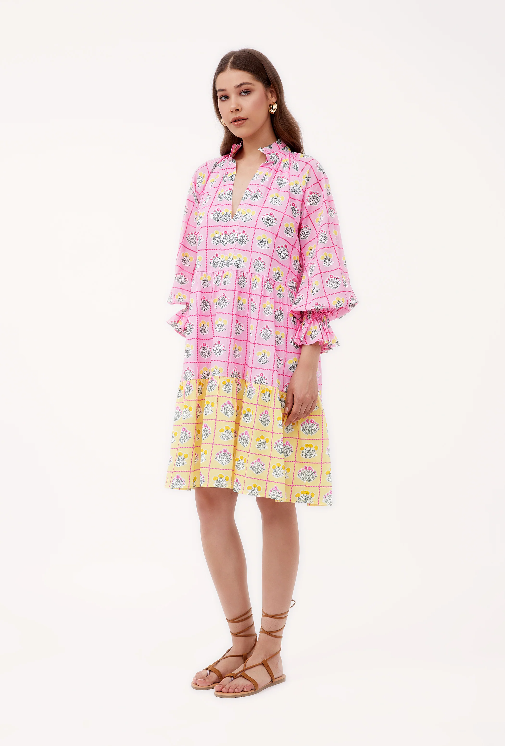 The Juliet is a flirty and effortless silhouette featuring a V-neckline and billowing sleeves. The pleats at the neck and tiered bottom give it an elegant touch. Juliet is made from a soft, breathable cotton cambric fabric that will keep you cool on a hot summer day. Inspired by a sun-drenched beach day, the artwork references the sorbet-colored beach umbrellas dotting Positano's coastline.