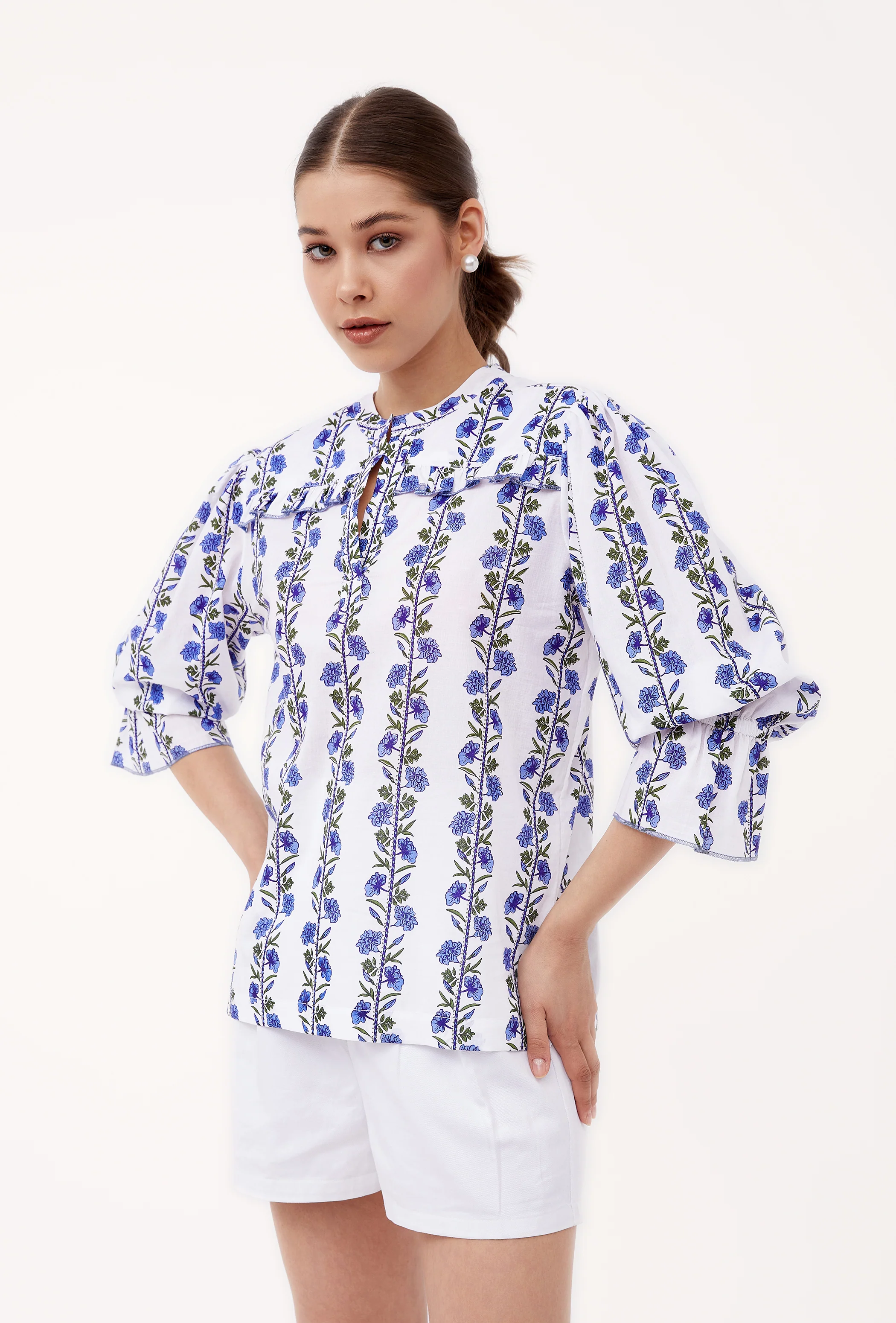 With its slightly puffed 3/4 sleeves, relaxed cut and delicate ruffle details, the Stella is a winner all year round. Pair it with our Gia Midi skirt or with Denim for a casual look. Stella is made from soft, breathable cotton. The print design captures the nostalgic ambiance of Italian country houses with its inspiration drawn from rustic drapes and table linens.