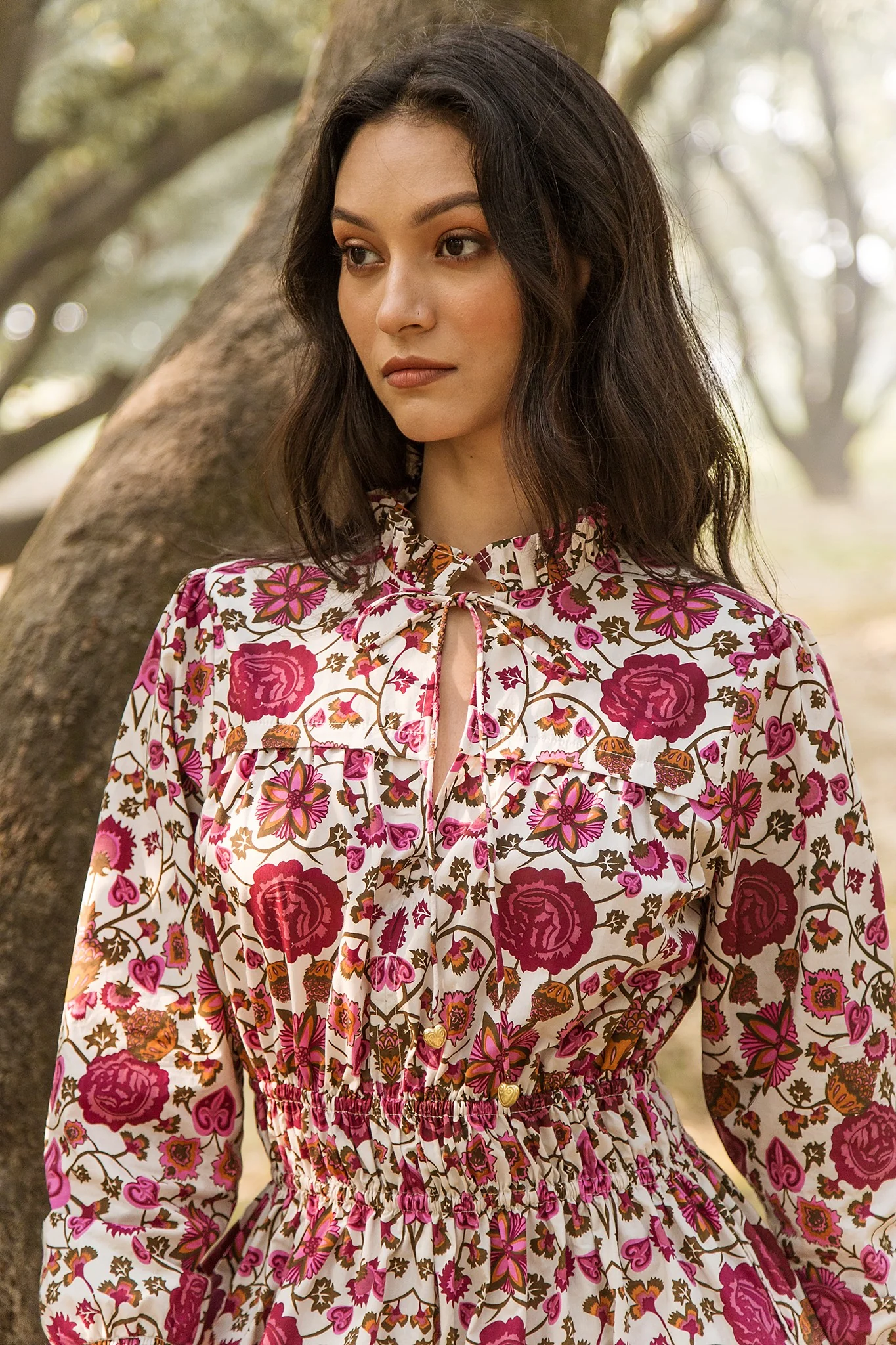 Our showstopper Alice dress features an elastic waist and smocked cuffs for a comfortable fit. The pleats on the collar, skirt and bodice give it a romantic touch. The collar ties are adorned with hand-made brass hearts. Alice is made from soft, breathable cotton. The floral print pays homage to the beauty of traditional embroidery artworks found in century old Austrian “Tracht” costumes.
