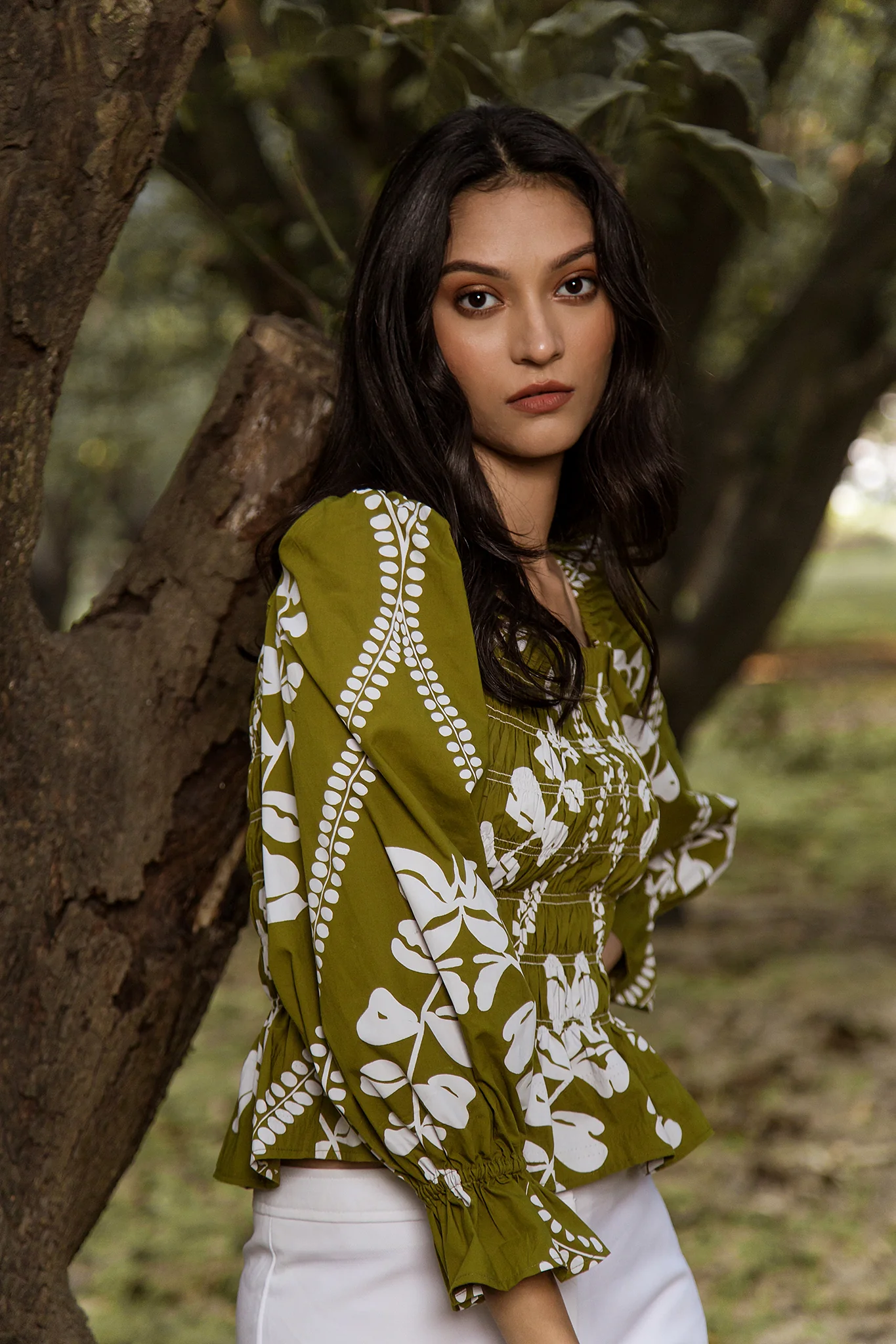 The Fabia is a fabulous day to night top, smocked through the bodice for a slim fit with slightly puffed sleeves and elastic cuffs. The subtle peplum hem accentuates the waist. Pair it with our Theresa pants or with jeans alike. Fabia is made from soft, breathable cotton. With this print, designer Vera Fritsch takes you on a journey to “Styria”, her home region in Austria. Because of its dense forests and lush meadows, it is often called the “Green Heart” of Austria.