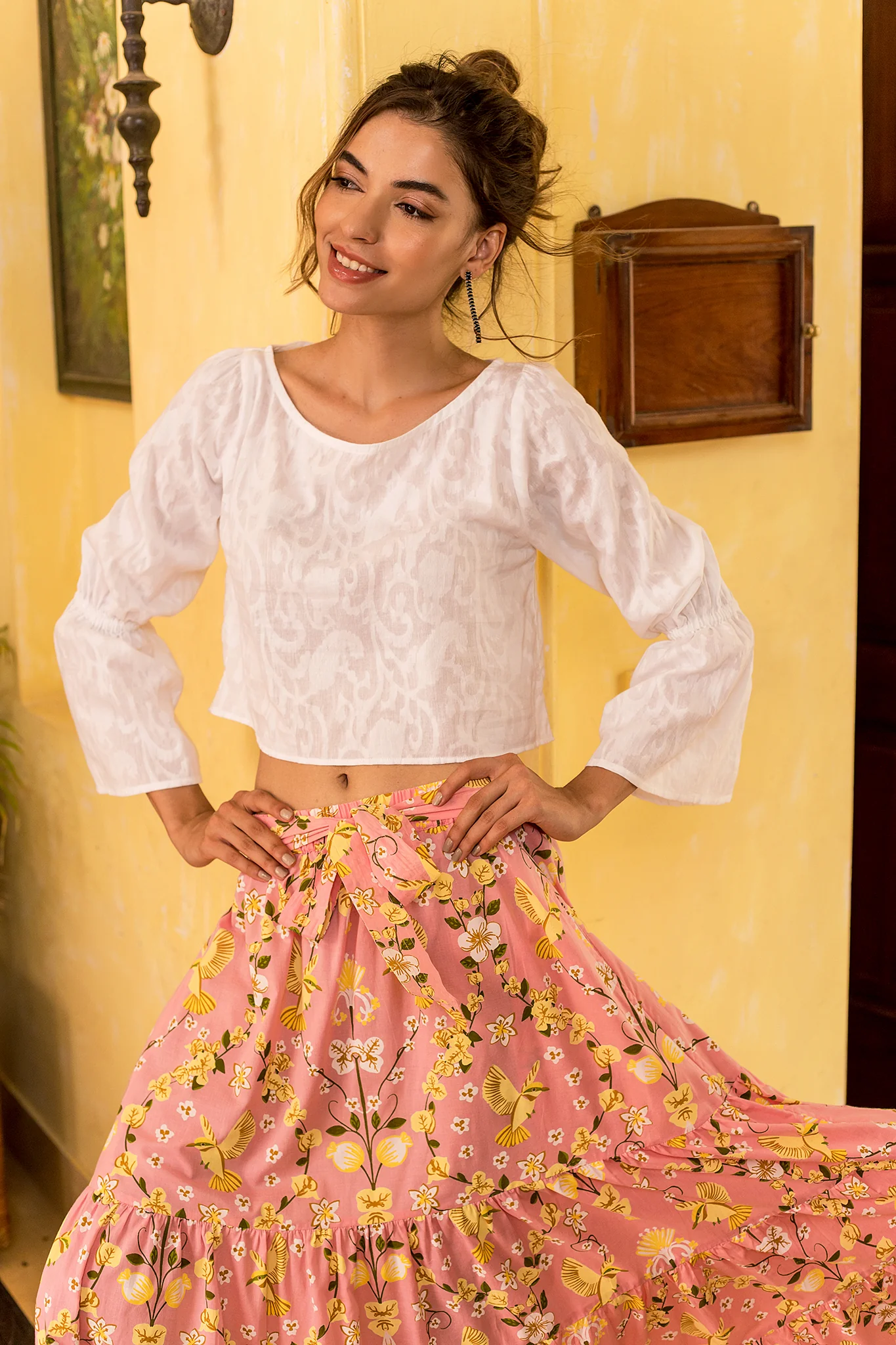 The Gia is a stunning Maxi skirt with a very comfortable fit that adjust to your body shape. Gia features a tiered A-line, an elastic waistband with attached self-tie belt and hidden pockets. Gia Skirt is made from a soft, breathable cotton cambric fabric that will keep you cool on a hot summer day. The vibrant artwork is inspired by the romantic nostalgia of Pondicherry's French mansions with patios covered in pink and peach bougainvilleas.