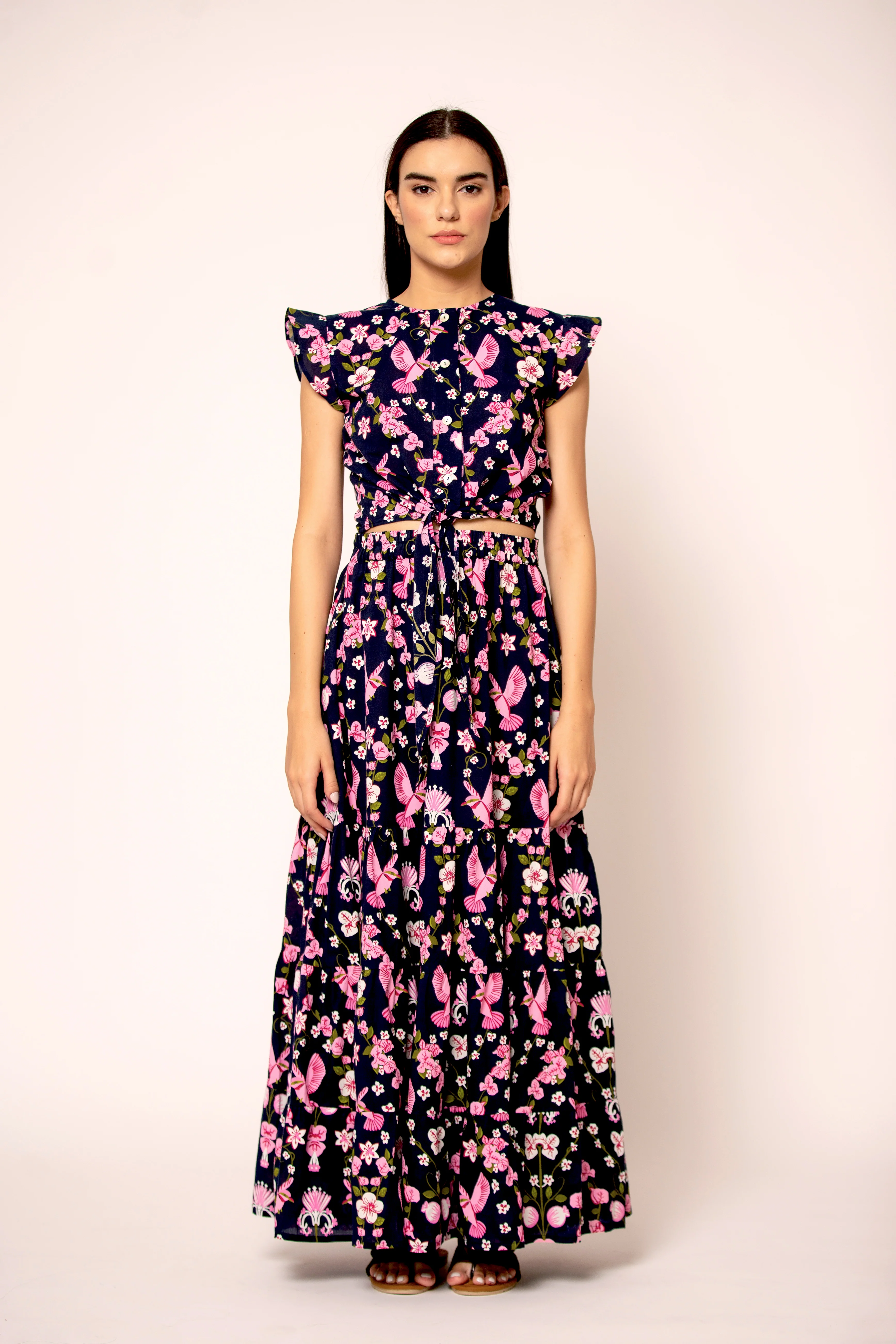 The Gia is a stunning Maxi skirt with a very comfortable fit that adjust to your body shape. Gia features a tiered A-line, an elastic waistband with attached self-tie belt and hidden pockets. Gia Skirt is made from a soft, breathable cotton cambric fabric that will keep you cool on a hot summer day. The vibrant artwork is inspired by the romantic nostalgia of Pondicherry's French mansions with patios covered in pink and peach bougainvilleas.