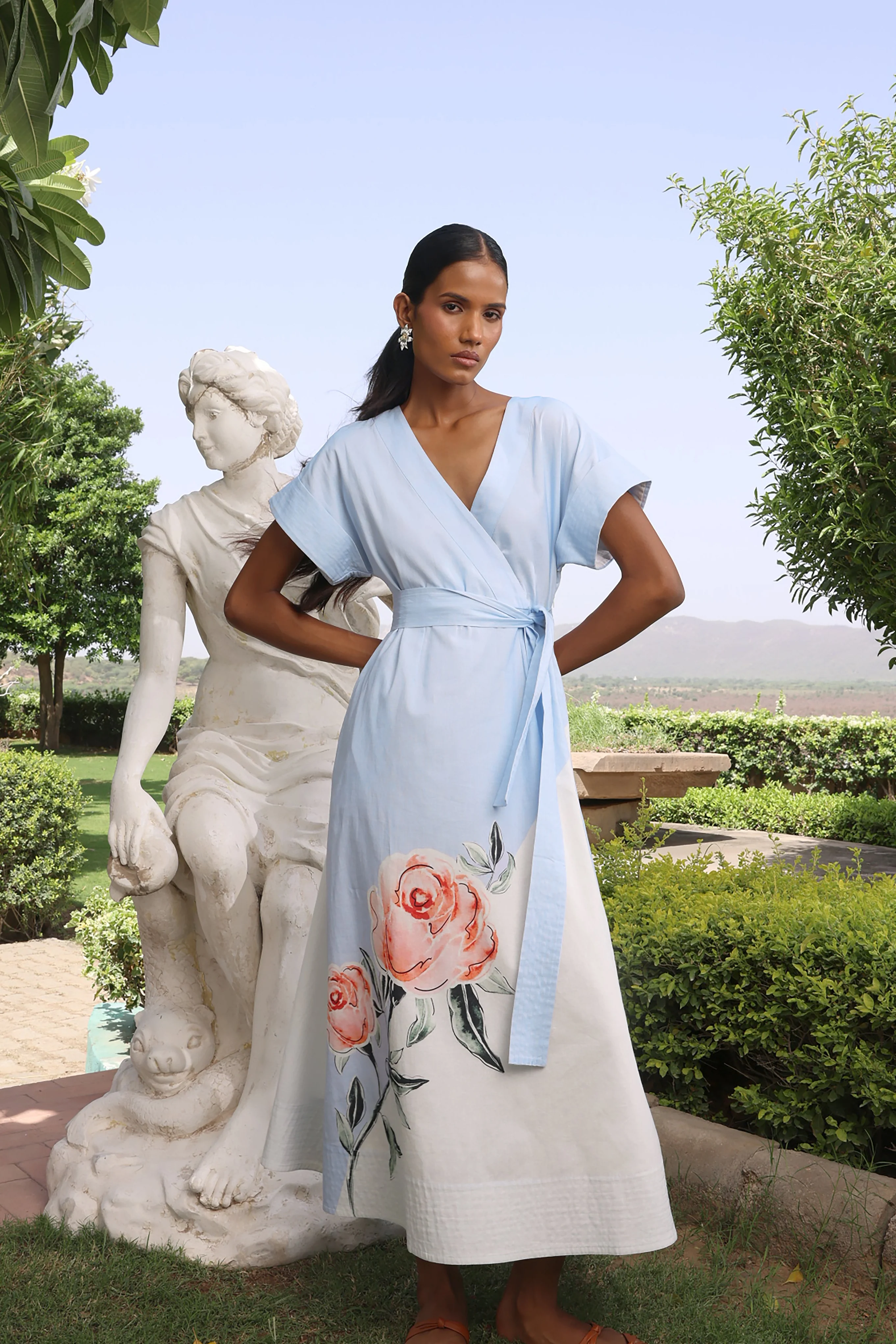 Sailor will be your most loved wardrobe staple. With short kimono sleeves, a V-neck, and a skirt that falls into a flattering A-line, this chic dress effortlessly blends sophistication with comfort. The relaxed waist can be accentuated with the included belt, making it perfect for any occasion. Sailor is crafted from a unique blend of cotton and linen, offering a soft, breathable feel and a beautifully textured finish. Named after Villa Céleste, a grand heritage home nestled along the cliffs of Cap Ferrat, this print draws from its sea-facing gardens and pale, weathered roses. Rendered in soft watercolors, the florals echo the quiet elegance of summers by the Mediterranean.