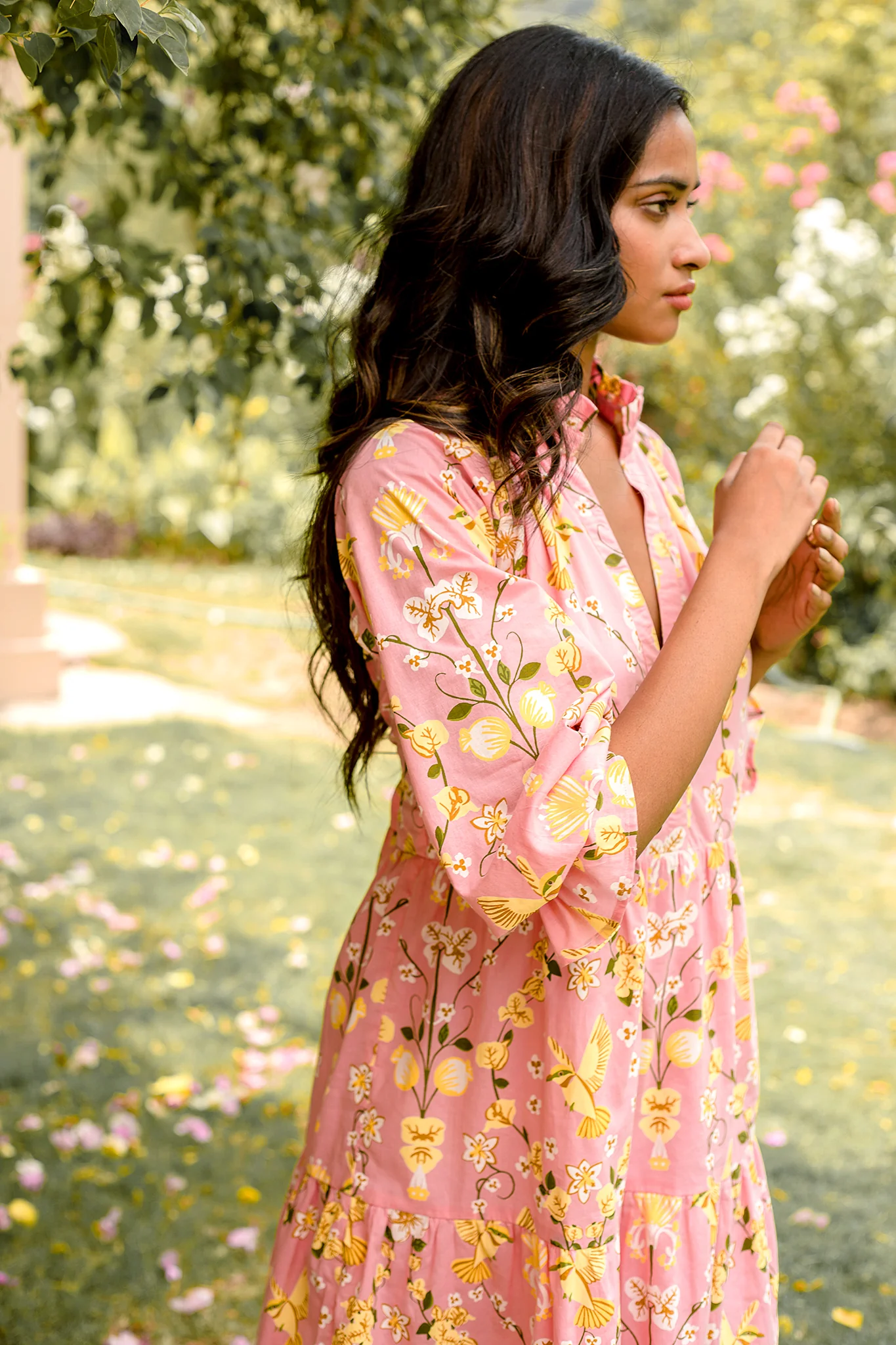 The Juliet is a flirty and effortless silhouette featuring a V-neckline and billowing sleeves. The pleats at the neck and tiered bottom give it an elegant touch. Juliet is made from a soft, breathable cotton cambric fabric that will keep you cool on a hot summer day. The vibrant artwork is inspired by the romantic nostalgia of Pondicherry's French mansions with patios covered in pink and peach bougainvilleas.